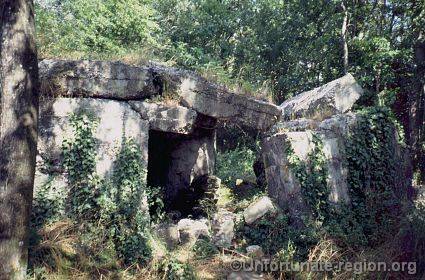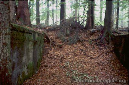 Follow the path on the right of the cemetery into the forest. Here two large German concrete structures can be found close to each other: an artillery position and a command center.