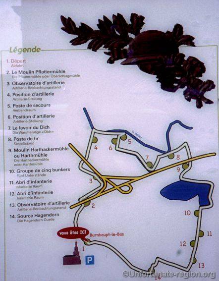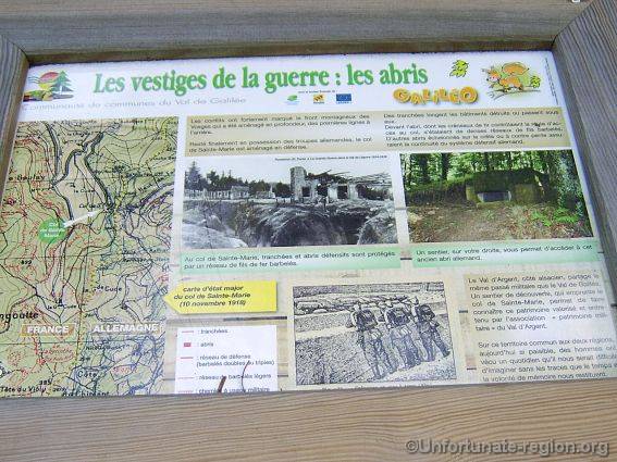 An sign in the cemetery explains how on 21-22 August 1914 French (mainly of the 21st Bn. Chasseurs a Pied) and German forces clashed on the Petit Donon. It also tells how in this region the first German Regimental flag was captured by the French and how it was proudly displayed in Paris. Research by our guide Eric Mansuy using contemporary letters in the possession of relatives of the soldiers involved show that the true story is slightly different. Some of the German soldiers involved were from Alsace / Loraine themselves and considered themselves more French then German. Many of these troops took the first opportunity to surrender. One of these soldiers told his French capturers that he was the flag barer and that he had hidden 'that bloody German flag' on a nearby farm and that he would gladly show where it was. This is how the first German Regimental flag was 'captured'....