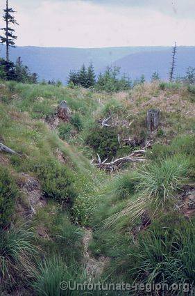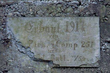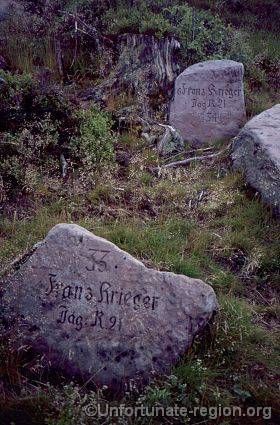 The whole hill is littered with stones that have a number on them and commemorate different numbers of Unknown French or German soldiers. From the memorial on top we know if was a Gefreiter (Private) Gerhardt who made these inscriptions. The photo below shows two stones in sequence (No's 33 and 34) but usually there is no logical sequence. There are stones that have tumbled down the mountain over the years or fell over hiding their inscribed side. Research in archives by people researching this site has to date not brought a map to light. It is also unknown if the unknowns are still buried on the site or if they were removed during or after the war.