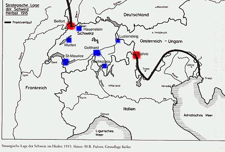 In spring of 1915, with the new frontline between Italy and Austria, the situation for Switzerland changed again. The "open gap" between the Western Front and the new Southern Front (red marks on following map) could invite an attack through Swiss territory – the French "plan H" and the Italian "Linea Cadorna" confirm that such plans or fears existed.