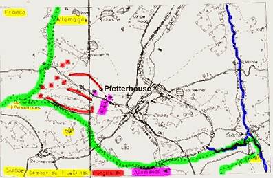 French & German lines ending at the Swiss border at the Largue river northeast of Porrentruy and Swiss strong points (yellow marks) in that area.
