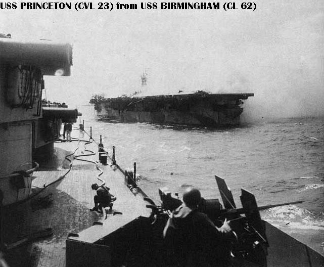 Redesignated CVL 23 15 July 1943. Served with the Carrier TF during WWII. Bombed 24 October 1944 during Battle of Leyte Gulf; serious damage and fires resulted. Cruiser Birmingham came alongside to assist. Fires were nearly brought under control when bombs stored in aft torpedo magazine exploded, causing massive destruction aboard and seriously damaging Birmingham. Fires spread out of control; ship was abandoned and scuttled with torpedoes. Contrary to commonly published reports, no torpedoes were involved in the fatal explosion.