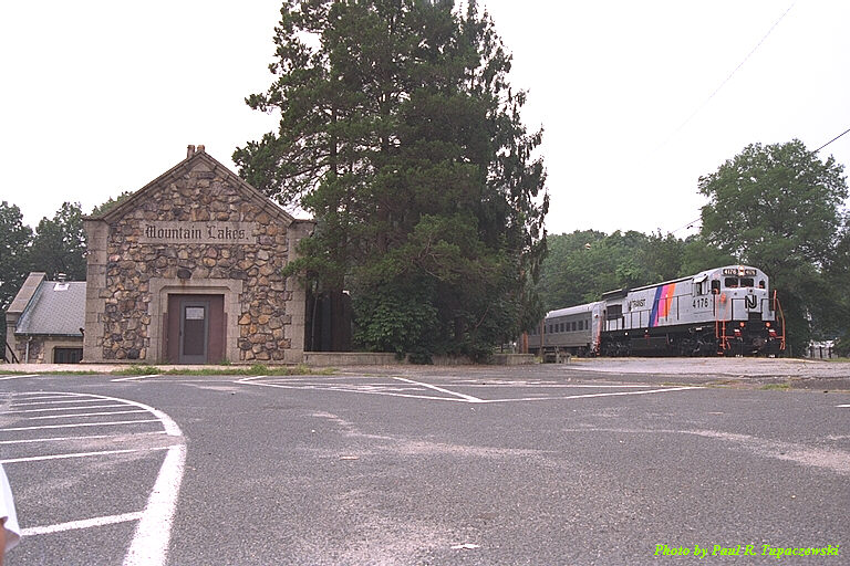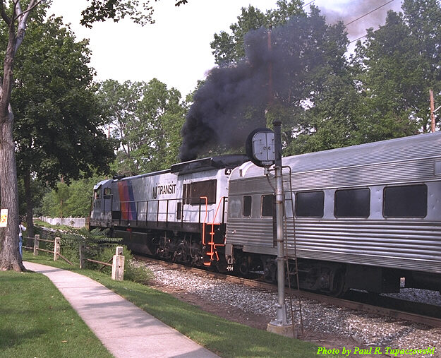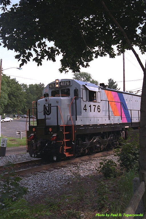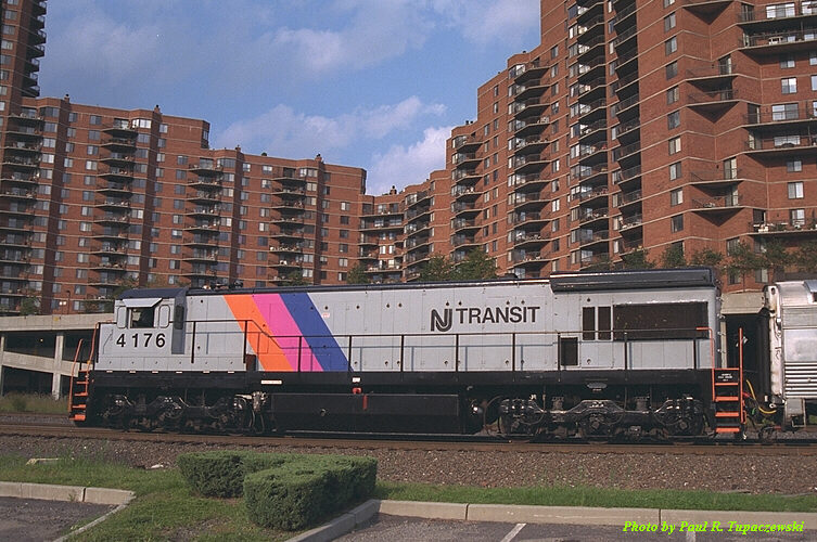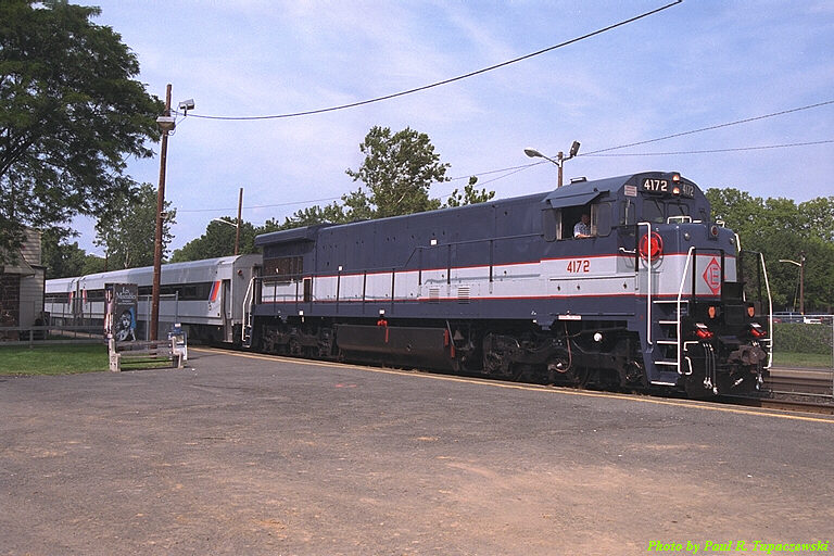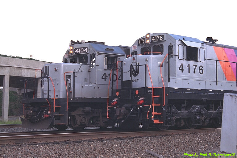 In the late 1960's, the Erie Lackawanna Railway was looking to replace its old and tired E8's and RS3's running commuter service out of Hoboken, New Jersey. The units were getting cranky and harder to maintain, and the Stillwell and Boonton coaches they pulled were no younger -- some approaching 50 years of age! Citing mounting deficits for the commuter trains, the EL was able to enlist the help of the New Jersey Department of Transportation. NJDOT agreed to fund the purchase of new commuter engines and cars. The question was: What to buy? Pullman-Standard offered to design new commuter coaches for NJDOT; the new "Comet" coaches, as they were designated, represented the first new non-MU commuter coaches in several decades. Their striking white aluminum body with black window band and small tinted windows resembled nothing ever seen before. Climate control and large, well-lit space gave commuters much to cheer. Since the Pullman-Standard cars had electric lighting, heat and air conditioning, a locomotive that could provide power was required. With Alco exiting the locomotive business just a year earlier, the obvious choice seemed to be EMD's FP45. However, General Electric approached NJDOT with a proposal for a new locomotive designed for commuter service. The locomotive was to be based upon the U33C, with an upgraded prime mover that output 3,600 horsepower. There would also be a generator driven off the prime mover to power the cars. The generator effectively reduced the usable horsepower to 3,400. The idea of an integrated generator appealed to NJDOT, and an order was inked for 32 of the ground-breaking units. The U34CH also proved to be the predecessor of GE's U36C, as well. The new units proved to be ground-breaking in areas other than technical. They came dressed in an NJDOT-specified scheme -- a very dark blue body with a silver stripe running around the unit at cab- floor-level, with red separating stripes. A red EL logo graced the ends of the unit, while NJDOT "arrows" decorated the sides. The units proved to be very striking in appearance. To conform to the EL numbering scheme, the new units were given numbers 3351-3382. By early 1973, all the units had arrived and were in service. The last EL commuter E8's were transferred to freight service in late 1974. With the coming of Conrail, the NJDOT units were renumbered into the former Penn Central's commuter diesel number slot, being assigned numbers 4151-4182. One was even repainted in a bicentennial scheme for a short time! However, CR wanted to rid itself of all commuter service. Therefore, in 1978, the State of New Jersey formed an organization called NJ TRANSIT to take over all commuter service in New Jersey. In addition, the State of New York's commuter authority, Metro-North, purchased new coaches to help cover the expense of the interstate runs. Metro-North also purchased a single U34CH, numbered 4183, from GE. This unit was unique, as it was rebuilt from a former C&NW U30C. The unit was painted to match the rest of the NJT fleet. NJT overhauled many of the U34CH's in the early 1980's, painting several in the NJ TRANSIT "disco" paint scheme of silver with orange/magenta/blue diagonal stripes. The units continued running until time began taking its toll, and slowly, one by one, were removed from service. The story doesn't end quite yet, though. Philadelphia's commuter authority, SEPTA, needed some temporary diesel aid when several of their electrified lines were de-electrified for rebuilding. NJT came to their aid by leasing three U34CH's to the commuter authority on a short-term basis. Amazingly, one of the U-boats was repainted into SEPTA blue paint! After a few months of service, they were returned to NJT. The death knell was sounded for the U34CH's when NJT signed a contract to purchase 19 rebuilt GP40PH-2B units from Conrail's Juniata Shops in Altoona, Pennsylvania. After the first units arrived in 1993, the rest of the U-boats were slowly taken out of service. Recognizing the significance of their departure, the United Railway Historical Society sponsored a "Farewell to the U34CH" excursion on August 27, 1994. The excursion was originally scheduled to travel to Denville via the Boonton Line, then return and travel to Spring Valley, New York via the Pascack Valley Line. However, once boarded, the trip itinerary proved otherwise -- the assumed two-line trip now blossomed into a trip that covered every Hoboken-based diesel line! The trip left Hoboken soon after 9 AM, and once out of the Bergen Tunnels, switched over to the former Erie Greenwood Lake Branch, today's Boonton Line. This was a trip to be valued as well, as this portion of the Boonton Line is slated to be abandoned in favor of a rerouting through Montclair in 1996. After a leisurely trip along the Boonton Line (the former Erie Greenwood Lake Branch and ex- DL&W Boonton Line), the first photo stop was held at Mountain Lakes. A quaint little stone passenger station made for a handy prop for this stop. The trip organizers also performed yeoman service in manually getting a large red dumpster out of camera range! (Photo) The trip then continued on to Denville, where the Boonton Line meets up with the Morris & Essex Line (former Lackawanna electrified main). The train then stopped again at the current end of the line, Netcong. Another former Lackawanna brick station stands here, serving this once-former junction of the Lackawanna's Sussex Branch, traces of which can still be seen from the station parking lot. A photo stop was also held here, to allow passengers to step off and stretch their legs. Once all the passengers reboarded, the train reversed direction and returned via the Morris & Essex Line. Passing Denville, a newly rebuilt GP40PH-2B and U34CH 4166, wearing an ersatz EL diamond on its side, waited for our train to clear so they could continue on their way in work train service. The train made an uneventful journey to West End, the junction of the former Er