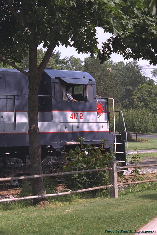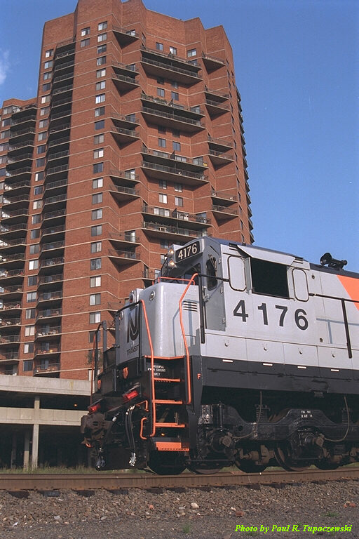 Photo captions (given by filename):EL4172A.JPG: "Erie Lackawanna" 4172 pulls forward during a photo stop at Suffern, New York. This line was one of the U34CH's main haunts for the past two decades. EL4172B.JPG: U34CH 4172 basks in the sun at the Radburn, New Jersey station, along the former Erie Railroad "Bergen County Line." HARMONCV.JPG: The classic lines of a General Electric U-boat complement the towers of the Harmon Cove condominium complex during a late-day photo stop at Secaucus, New Jersey. The former EL Croxton Yard lies a quarter-mile to the right of the photograph. HARMONC2.JPG: The brutish pug nose of U34CH 4176 poses grandly in front of the Harmon Cove condominium complex at Secaucus, New Jersey. MTLAKES.JPG: Freshly repainted NJ TRANSIT U34CH 4176 offers a unique contrast to the classic Lackawanna Railroad stone-construction Mountain Lakes, New Jersey station, during a photo stop on the United Railroad Historical Society's "Farewell to the U34CH" excursion. ORADELL.JPG: U34CH 4176 reposes in the shadows at Oradell, New Jersey, on what once was the Erie's New Jersey & New York line. ORADELL2.JPG: The engineer on U34CH 4172 enjoys his brief respite while posing for photographs at Oradell, New Jersey. Just another quaint scene in Northern New Jersey. SMOKEU34.JPG: Something commonly seen while in regular commuter service, but rarely visible during this excursion, was a thick plume of black smoke, accompanied by that characteristic GE "chugging" - obviously a very close cousin of Alco! TWONJT.JPG: The Victor and the Vanquished. NJ TRANSIT U34CH 4176 poses next to GP40PH-2 4104 at Secaucus, New Jersey. The Geep was built for the Jersey Central Railroad in the late 1960's, and the entire fleet was recently rebuilt by Conrail for service well into the 21st Century. The U-boat will enjoy no such luck. |