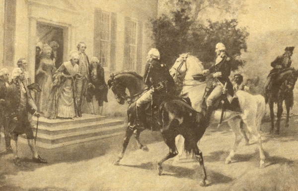 Martha and General Washington welcome the visit of General comte de Rochambeau to Mount Vernon on 10 September 1781. This rather stylized depiction is believed to have been part of a series painted circa 1885 by J.L. Ferris. It was taken from an illustration in a Bicentennial booklet George Washington by Herman S. Fey.