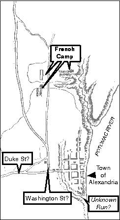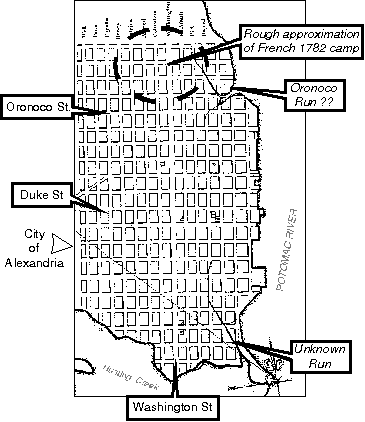 The map of the French 17-29 July 1782 campsite incorporates a layout of the town of Alexandria. There is no scale to the map. It is really a sketch and it is difficult to discern if the depiction of the town streets and roads were accurately related. A 'best guess' is that the main north-south route depicted is what is now Washington Street. The main west-east route is the current Duke Street. The French map shows two small creek runs off the Potomac. Each of the runs exhibits a definite northward trace, which does not correlate to either of the modern runs in the area: Hunting Creek (to the south) or Four Mile Run (to the north).