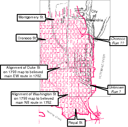 The two runs of the French 1782 map, appear to be repeated in a 1798 map that shows a reliable correlation between the city-blocks and streets as they are known today in Alexandria. The 1798 map is not scaled, but significantly it shows the two runs, each with a definite northward trace, inside the town limits of Alexandria. The traces of the southern most run appear to align when overlaying both maps; the run appears to have taken its northward direction along where Royal Street is now.
