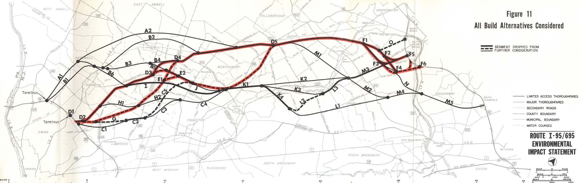 | In the preparation of the Somerset Freeway (I-95) and Somerset Freeway Spur (I-695) Draft Environmental Impact Statement (DEIS) in 1979, a wide variety of alignments for the freeway were reconsidered. This map from the DEIS shows all of those alignments. The various alignments were evaluated based on impacts and then gradually dropped from consideration. The thin lines were dropped first, and then the thick, non-reddened lines. The thick reddened lines were the alignments which remained and were the 'preferred alternatives' of the DEIS. Note that most of the original alignment from 1972 remained as a preferred alternative. Some interesting proposals here include the alternate intersection with the exisiting Scudders Falls Expressway (I-95) near Exit 3, as well as the far northwesterly and southwesterly alignments. Note that the alignment extending into Piscataway Township was quickly dropped, resulting in all alternatives having termini in the same area as the proposed Somerset Freeway Spur (I-695). This effectively eliminated a separate Somerset Freeway Spur (I-695) from plans. |