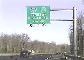 | This signage is just past the toll plaza on the Bristol Pike (US 13) ramp to the Pennsylvania Turnpike Delaware River Extension (I-276) in Bristol Township, Pennsylvania. Note that no reference to the New Jersey Turnpike or I-95 exists on the signage heading to New Jersey. Photo taken December 30, 2001. |