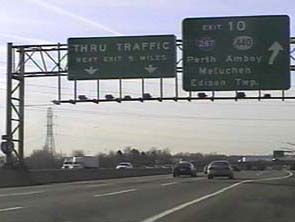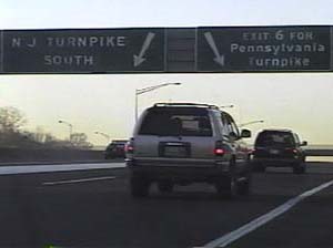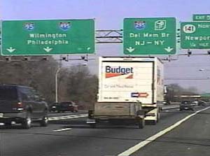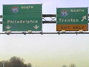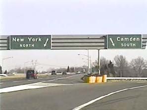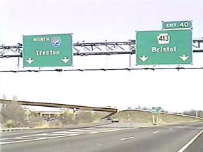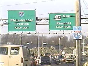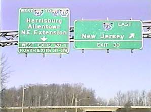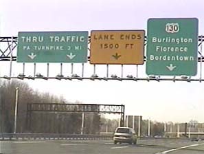 | This signage is on the New Jersey Turnpike Pennsylvania Extension (I-95) southbound just south of Exit 6(New Jersey Turnpike South, Camden, Delaware) in Mansfield Township, New Jersey. Photo taken January 15, 2002. |