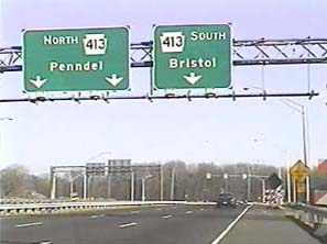 | This signage is on the Delaware Expressway stub northbound just north of Exit 40(PA 413, I-276, Pennsylvania Turnpike, Bristol, Burlington Bristol Bridge) in Bristol Township, Pennsylvania. In contrast with the photo above, this sign has the typical black-on-white Pennsylvania Turnpike trailblazer as it directs traffic to New Rodgers Road (PA 413) southbound for the connection to the Pennsylvania Turnpike Delaware River Extension (I-276). Photo taken December 30, 2001. |