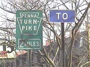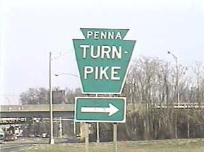 | This signage is on the Pennsylvania Turnpike Delaware River Extension (I-276) westbound just east of Exit 358(US 13, Levittown, Bristol) in Bristol Township, Pennsylvania. Note the standard white-on-green Pennsylvania Turnpike trailblazer used by the Pennsylvania Turnpike Commission here. Generally, the trailblazer does not appear on the mainline roadway itself, but as this is the eastern terminus of the Pennsylvania Turnpike system, it is posted here nonetheless. Photo taken January 15, 2002. |