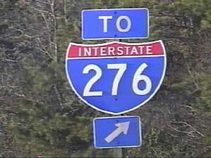 | This signage is on the New Jersey Turnpike Pennsylvania Extension (I-95) southbound south of Exit 6A(US 130, Burlington, Florence, Bordentown) in Florence Township, New Jersey. This is the final "To I-276" assembly, as this is just north of the Delaware River bridge approach, which becomes I-276 upon crossing the state line. Photo taken December 30, 2001. |
