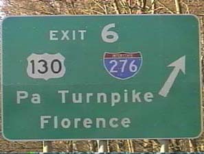 | This signage is on the New Jersey Turnpike (I-95) southbound just north of Exit 6(US 130, I-276, Pennsylvania Turnpike, Florence) in Mansfield Township, New Jersey. Unlike the shield assemblies, the large sign here incorrectly refers to the New Jersey Turnpike Pennsylvania Extension (I-95) as I-276. This sign is new and was posted in 2000 when the fully directional Exit 6A was opened connecting to Burlington-Bordentown Road (US 130). The previous signs only referred to the Pennsylvania Turnpike and properly did not sign any route numbers. Photo taken January 15, 2002. |
