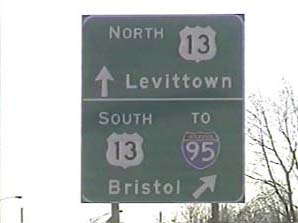 | This signage is on the Bristol Pike (US 13) southbound just north of New Rodgers Road (PA 413) in Bristol Boro, Pennsylvania. This is more prominent signage of I-95. Photo taken December 30, 2001. |