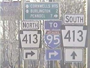 | This signage is on New Rodgers Road (PA 413) southbound at the Bristol Pike (US 13) in Bristol Boro, Pennsylvania. The I-95 Eastern Route follows the Bristol Pike (US 13) north towards the left. These signs were temporary construction signs due to the dualization of New Rodgers Road (PA 413) at the time. The construction likely contributed to the erroneous PA 13 shields displayed here (instead of US 13 shields), and to the lack of any signage directing one towards the Pennsylvania Turnpike Delaware River Extension (I-276). Photo taken December 30, 2001. |