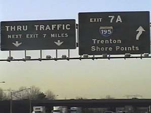 | This signage is on the New Jersey Turnpike (I-95) southbound at Exit 7A(I-195, Trenton, Hamilton, Shore Points) in Washington Township, New Jersey. The I-95 Western Route exits here and follows the Central Jersey Expressway (I-195). Note that no indication is made that a connection to I-95 southbound is available via this exit. Photo taken January 15, 2002. |