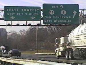 | This signage is on the New Jersey Turnpike (I-95) southbound at Exit 9(NJ 18, US 1, New Brunswick, East Brunswick, Shore Resorts, Rutgers University) in New Brunswick, New Jersey. The I-95 Gap Western Bypass leaves I-95 here and follows the Old Bridge-New Brunswick Turnpike (NJ 18) to the New Brunswick-Metuchen Bypass (US 1). Photo taken January 10, 2002. |