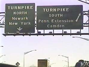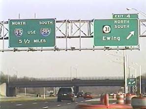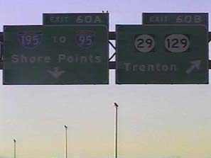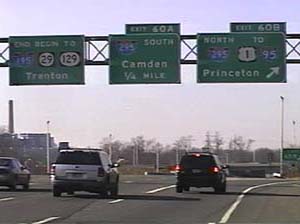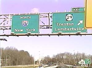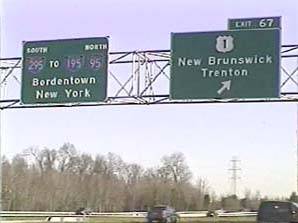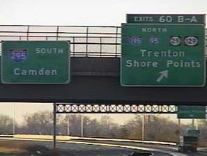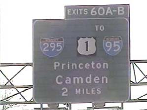 | This signage is on the Camden Freeway (I-295) southbound just north of Exit 67(US 1, New Brunswick, Trenton) in Lawrence Township, New Jersey. Photo taken December 30, 2001. |