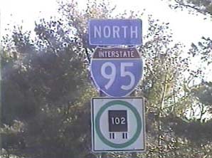 | This signage is on the Camden Freeway (I-95) southbound south of Exit 67(US 1, New Brunswick, Trenton) in Lawrence Township, New Jersey. This is the first shield assembly after passing I-95's official terminus. It is also the first I-95 shield assembly after the I-95 Gap Western Bypass rejoins the I-95 Western Route via the Trenton-New Brunswick Turnpike (US 1). The sign with a #102 truck with a green circle around it is part of New Jersey's truck route system; all roads part of the National Highway Network have these shields, in response to calls for a ban on through trucks on non-national network roads (which contain signs with red cross-outs as opposed to the green circles). The 102 refers to the width of trucks restricted by the ban: 102 inches. Photo taken January 14, 2002. |