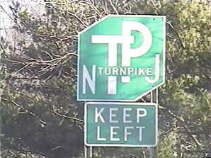 | This signage is on the Scudders Falls Expressway (I-95) northbound just north of Exit 1(NJ 29, Trenton, Lambertville) in Ewing Township, New Jersey. This is the first mention of the New Jersey Turnpike along I-95. Photo taken December 30, 2001. |