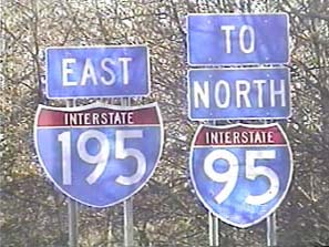 | This signage is at the split in the Exit 6 ramp from the Central Jersey Expressway (I-195) to the New Jersey Turnpike (I-95) in Washington Township, New Jersey. Note that I-95 is not signed here, though once the I-95/I-276 Interchange is completed in Pennsylvania, it will be added. The I-95 Western Route rejoins the I-95 Eastern Route here into a unified (officially and functionally) I-95. Photo taken December 30, 2001. |