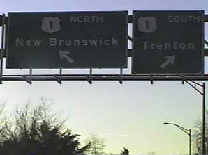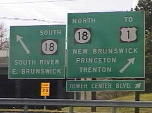 | This signage is on the New Brunswick-Metuchen Bypass (US 1) northbound north of the Ryders Lane interchange in North Brunswick Township, New Jersey. Photo taken January 10, 2002. |