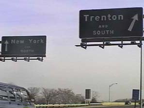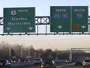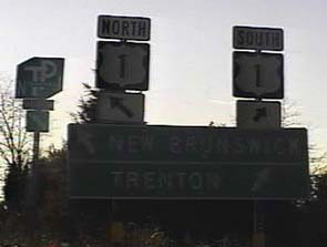 | This signage is on the Camden Freeway (I-295) southbound Exit 67 ramp to the Trenton-New Brunswick Turnpike (US 1) in Lawrence Township, New Jersey. The I-95 Gap Western Bypass follows the Trenton-New Brunswick Turnpike (US 1) north towards the left. Photo taken January 14, 2002. |