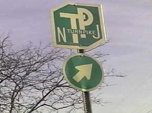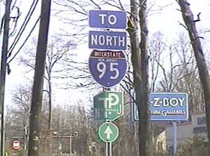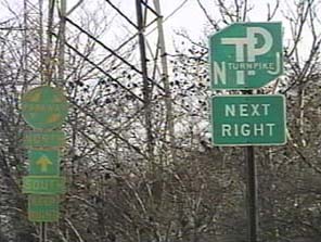 | This signage is on the Trenton-New Brunswick Turnpike (US 1) southbound at the Quakerbridge Mall Access Road in Lawrence Township, New Jersey. Photo taken January 14, 2002. |