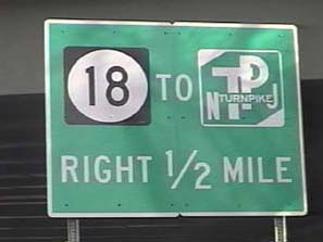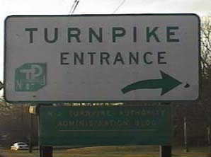 | This signage is on the Old Bridge-New Brunswick Turnpike (NJ 18) southbound at the New Jersey Turnpike (I-95) interchange in East Brunswick Township, New Jersey. The I-95 Gap Western Bypass joins the New Jersey Turnpike (I-95) towards the right. This signage is typical at non-freeway entrances to the New Jersey Turnpike. Note that this is also the site of the New Jersey Turnpike Authority Administration buildings. Photo taken January 15, 2002. |