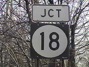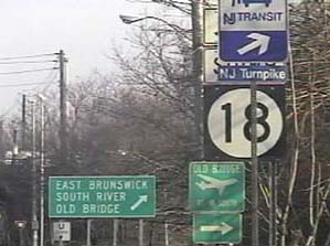 | This signage is on the Old Bridge-New Brunswick Turnpike (NJ 18) northbound just south of the New Brunswick-Metuchen Bypass (US 1) interchange in East Brunswick Township, New Jersey. The I-95 Gap Western Bypass follows the Old Bridge-New Brunswick Turnpike (NJ 18) north towards the left. Photo taken January 10, 2002. |