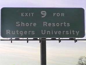 | This signage is on the New Jersey Turnpike (I-95) southbound north of Exit 9(NJ 18, US 1, New Brunswick, East Brunswick, Shore Resorts, Rutgers University) in Edison Township, New Jersey. Photo taken January 10, 2002. |