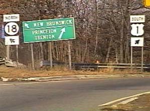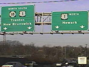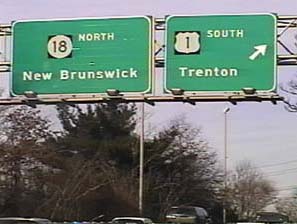 | This signage is on the New Brunswick-Metuchen Bypass (US 1) northbound south of the Old Bridge-New Brunswick Turnpike (NJ 18) interchange in New Brunswick, New Jersey. Photo taken January 10, 2002. |