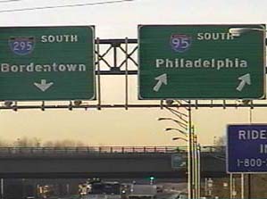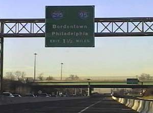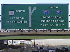 | This signage is on the Trenton-New Brunswick Turnpike (US 1) southbound ramp to the Camden Freeway (I-95 and I-295) in Lawrence Township, New Jersey. The I-95 Gap Western Bypass rejoins I-95 via the right ramp here. Photo taken January 14, 2002. |