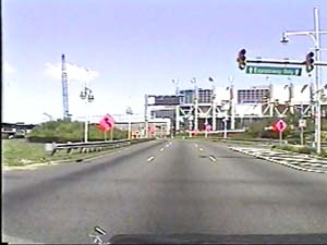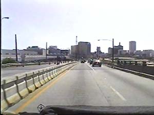 | This is the Atlantic City Expressway, NJ 446 east, just east of exit 2(US 40, US 322, Atlantic City via Blackhorse Pike) in Atlantic City. The city skyline is now visible in the distance. Filmed August 21, 2000. |