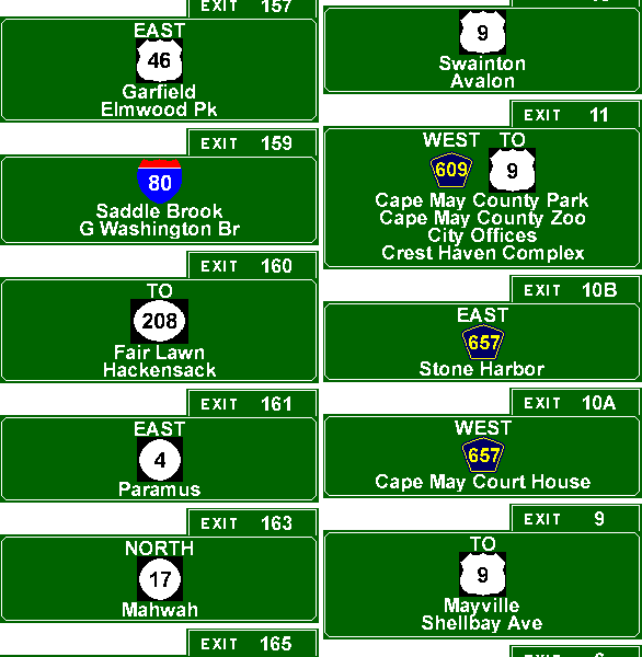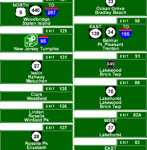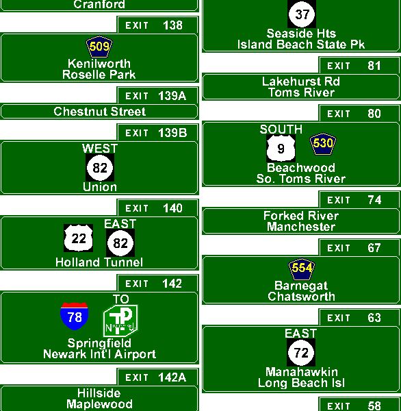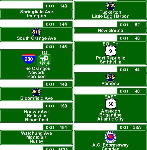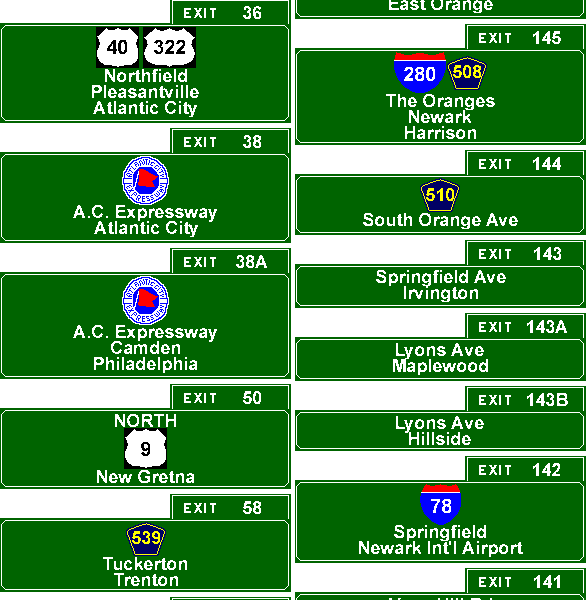 | Connecting Lists I-87 (Steve Anderson) GSP (Local Lanes) ACE NJ 138 US 9 NJ 440 I-95 (Eastern Route) I-95 (Western Route) NJTP I-78 (Local Lanes) I-280 NJ 19 I-80 Other Lists Dan Moraseski's List Bryan Katz's List pictures / map / exit list / article (Steve Anderson) Back to New Jersey Expressways and Tollways |