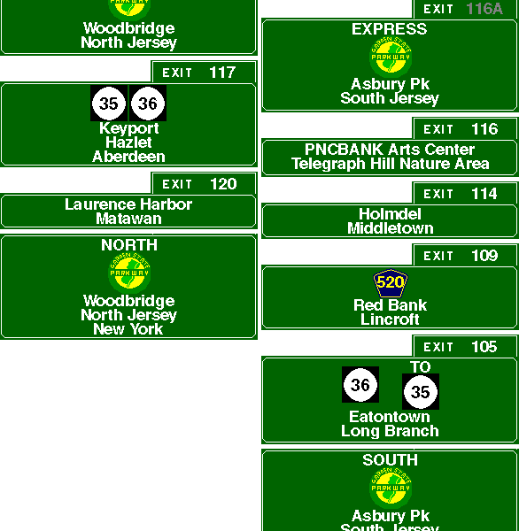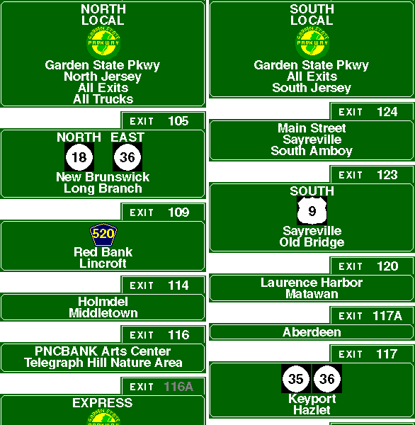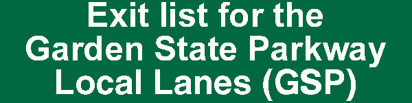 | Exit list for the Garden State Parkway Local Lanes (GSP). Exit graphics courtesy of Jeff Taylor and Scott Oglesby. |