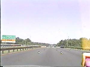 | This is the end of the Garden State Parkway Local Lanes, NJ 444 south, in Tinton Falls Boro. The Asbury Park Toll Plaza is directly ahead. The Garden State Parkway continues south without the dual-dual carriageway. Filmed July 24, 2001. |