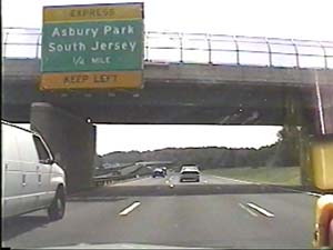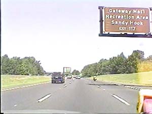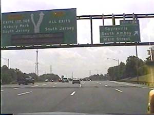 | This is the Garden State Parkway Local Lanes, NJ 444 south, at exit 105(NJ 36, To NJ 35, Eatontown, Long Branch) in Tinton Falls Boro. Filmed July 24, 2001. |