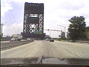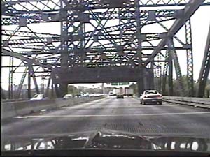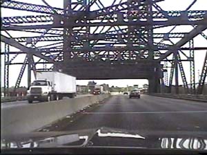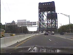 | This is the Essex Freeway, I-280 east, just east of exit 15(South NJ 21, Downtown, Ironbound), crossing the Stickel Bridge leaving Newark for Harrison. Filmed July 27, 1999. |