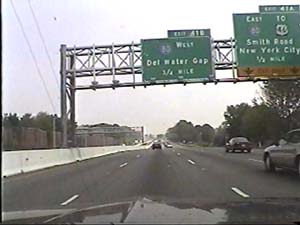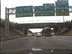 This is the Middlesex Freeway, I-287 south, at exit 21(I-78, Easton PA, New York City) in Bedminster Township. Filmed July 31, 1999. |