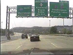 | This is the Middlesex Freeway, I-287 south, at exit 52(NJ 23, Riverdale, Wayne, Butler) in Riverdale Boro. Filmed July 31, 1999. |