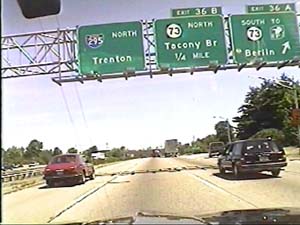 | This is the Camden Freeway, I-295 north, at exit 36(NJ 73, To New Jersey Turnpike, Berlin, Tacony Bridge) in Mount Laurel Township. Filmed August 10, 1999. |