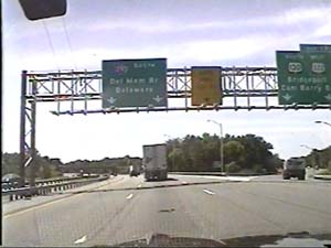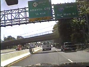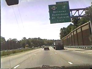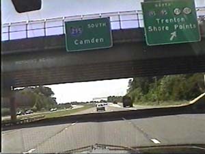 | This is the Camden Freeway, I-295 south, north of exit 61(Arena Drive East, Whitehorse Avenue) in Hamilton Township. Filmed August 10, 1999. |