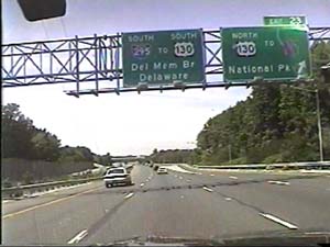 | This is the Camden Freeway, I-295 south, at exit 13(South US 130, West US 322, Bridgeport, Commodore Barry Bridge) in Logan Township. Filmed August 10, 1999. |