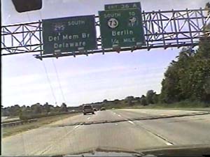 | This is the Camden Freeway, I-295 south, at exit 36(NJ 73, To New Jersey Turnpike, Tacony Bridge, Berlin) in Mount Laurel Township. Filmed August 10, 1999. |
