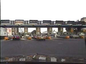 | This is the end of the North-South Freeway, I-676 north, at the Benjamin Franklin Bridge toll plaza in Camden. I-676 continues north as the Benjamin Franklin Bridge, which is directly ahead. Filmed July 27, 1999. |