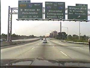 | This is the North-South Freeway, I-676 south, at exit 3(Morgan Boulevard, To Broadway, To Port Terminals) in Camden. Filmed July 27, 1999. |