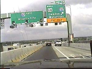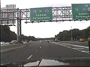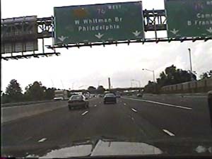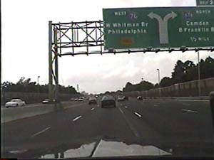 | This is the end of the North-South Freeway I-76 west section, as it merges with NJ 76C in Camden. I-76 continues west as the Walt Whitman Bridge, which is directly ahead. Filmed July 1, 1999. | ||||||||||||