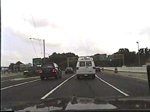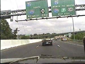 | This is the North-South Freeway, I-76 east, at the I-295/NJ 42 junction in Bellmawr Boro. The former I-295/I-76 multiplex in this direction is now separated by the concrete Jersey barrier on the right. Filmed July 1, 1999. | ||||||||||||